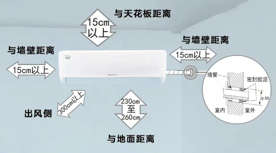 空調內機回風口與室外空間的距離決定了運行效果。回風距離過近會導致回風量不足,制冷效果差。內機與天花板距離宜在15cm以上,距離墻壁12cm以上,距離地面230-260cm最佳。確保進出口暢通無阻,讓送風無障礙!